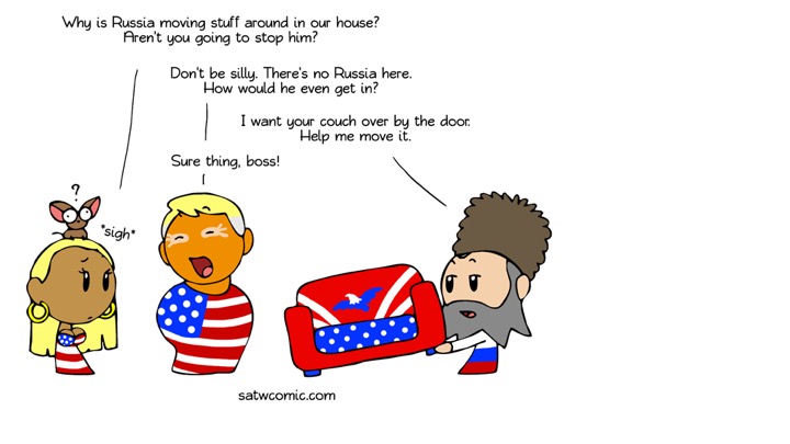 This is a satirical touch on what is going on in Scandinavia and what the global players look like from a Scandinavian perspective. It is a very odd comic strip because almost all of the strips need explaining. (I guess it is just like "the Cartoonist View" in an American newspaper requires that one knows a little about what goes on in the U.S.)