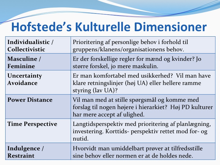 Der er mulighed for at sammenligne kulturprofiler langs teoriens dimensioner for langt de fleste lande her, og hvis man ser på beskrivelserne af dansk kultur i forhold til amerikansk, er der f.eks. tydelige forskelle i f.eks. Magtdistance og Masculinity.